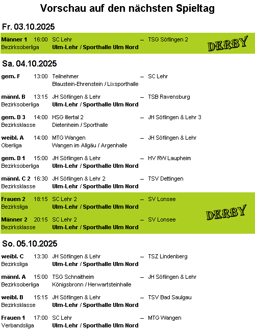 Die Handballabteilungen des SC Lehr und der TSG Söflingen haben sich 2021 zu einer Spielgemeinschaft zusammengeschlossen und wollen Kindern und Jugendlichen in Ulm den Handballsport als Spielgemeinschaft näher bringen. Gemeinsam treten wir als „Jugendhandball Söflingen & Lehr“ an den Spieltagen und Wettkämpfen auf. Weitere Informationen über die Zusammenarbeit gibt es hier